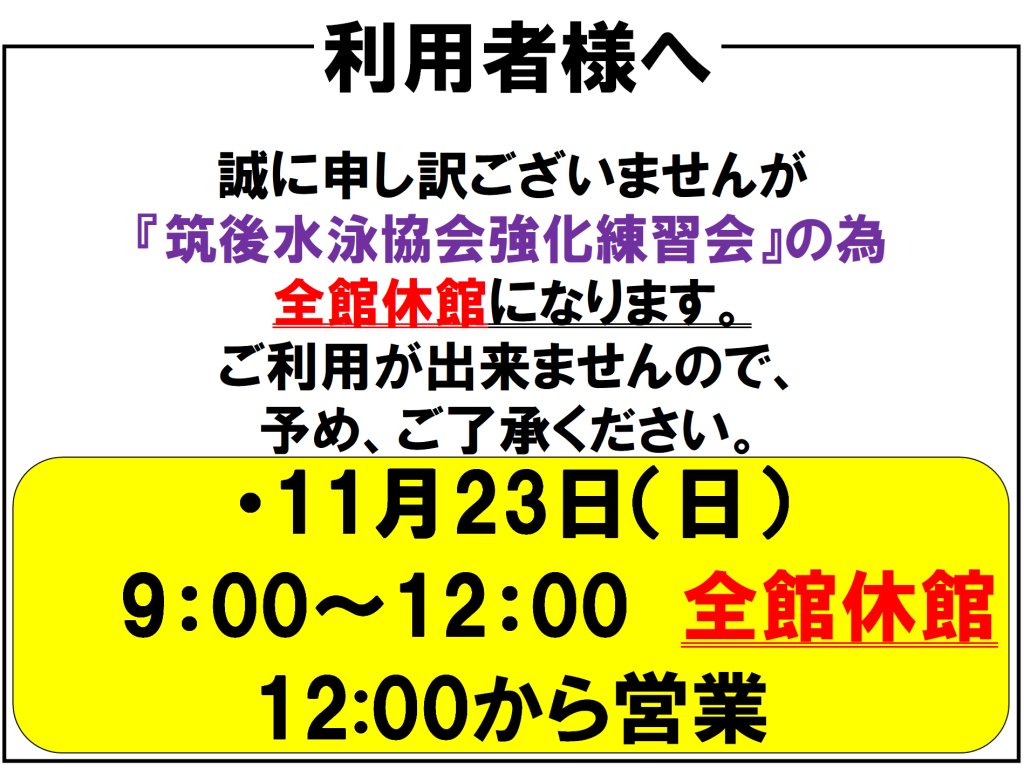11月23日(日)9:00~12:00筑後水泳協会練習会の為全館占用利用となります。