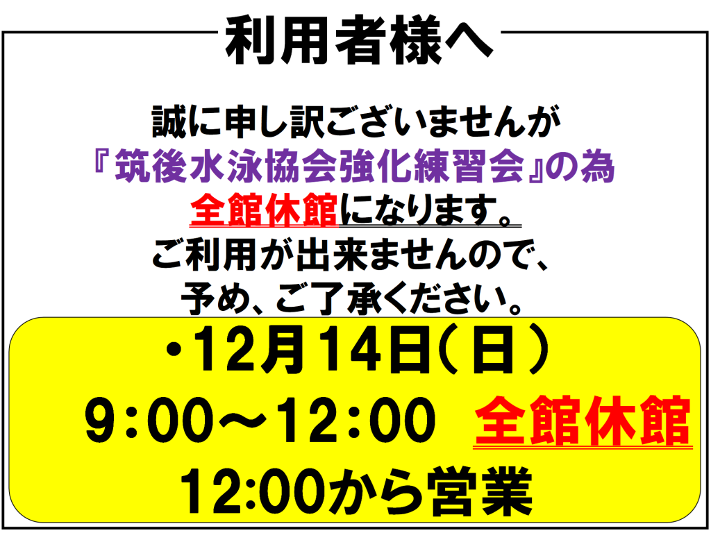 12月14日(日)は筑後水泳協会全館占用利用の為営業時間が変更となります。