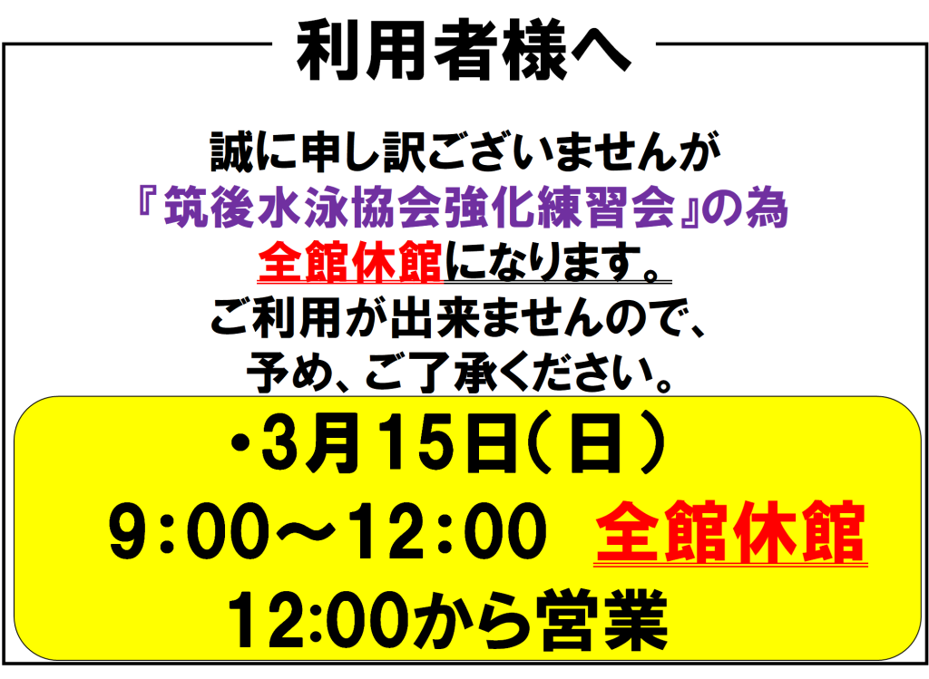 3月15日(日)は筑後水泳協会練習会の為9:00~12:00までの間全館ご利用できません。